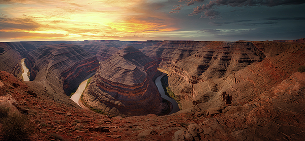 A dramatic sunset illuminates the winding river cutting through the vast, rugged canyon landscape. The sky is painted with hues of orange and yellow,... more